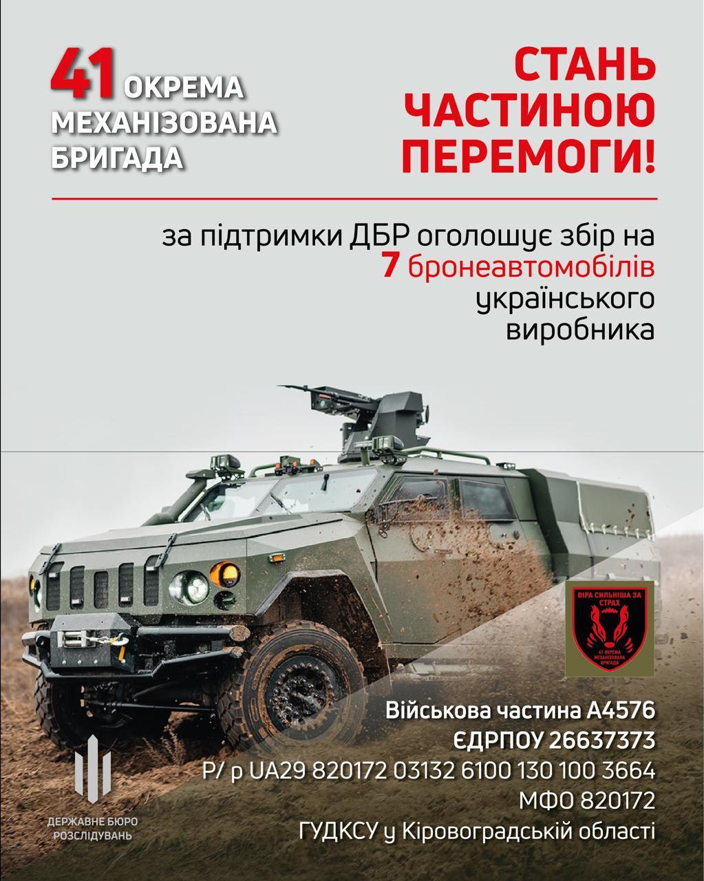 За підтримки Державного бюро розслідувань 41 окрема механізована бригада оголошує збір коштів на придбання бронемашин для своїх бойових підрозділів.